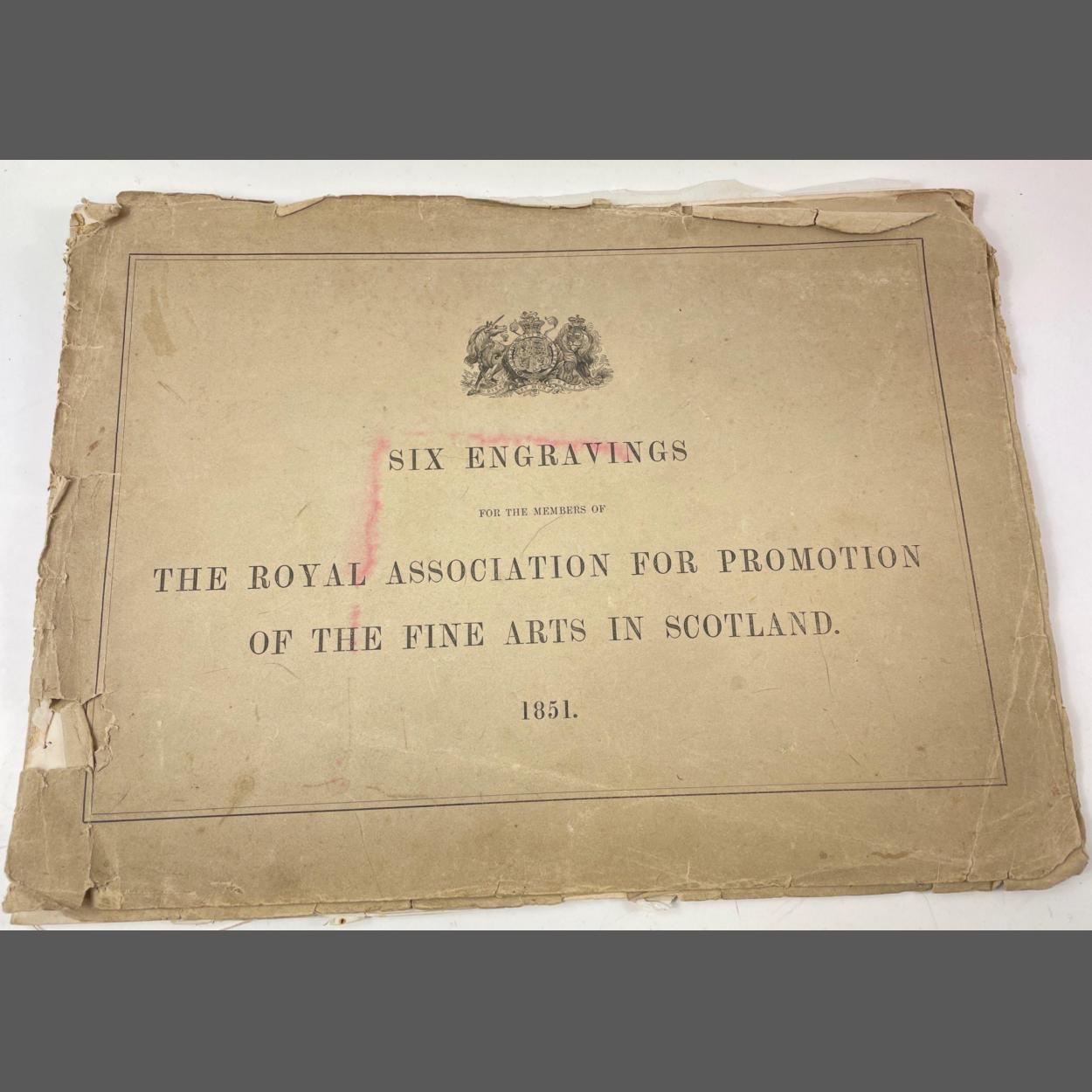 Folio of Etchings 1851. Six Engravings for the members of The Royal Association For Promotion Of The Fine Arts In Scotland. Complete and rare but with condition issues, edges are worn and there is staining to some