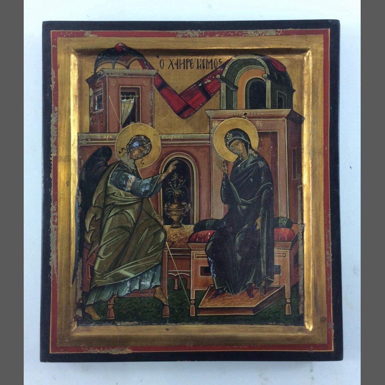 A 20th century copy by FILIP DRAGOS, of a 15th century icon 'Vestirea' (The Annunciation) held at the Tretyakov Gallery, Moscow, Russia, 28x32cm, purchased in Russia