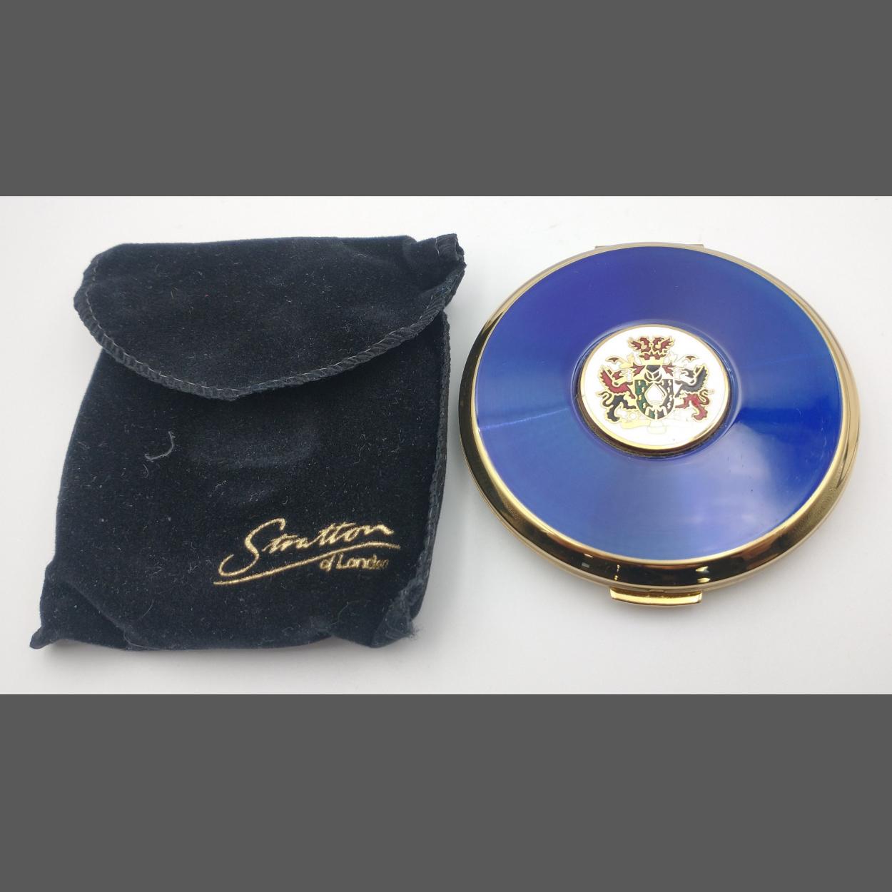 A STRATTON of LONDON face powder compact ( 8cm dia), with a royal blue face and coat of arms design, comes with pouch and box