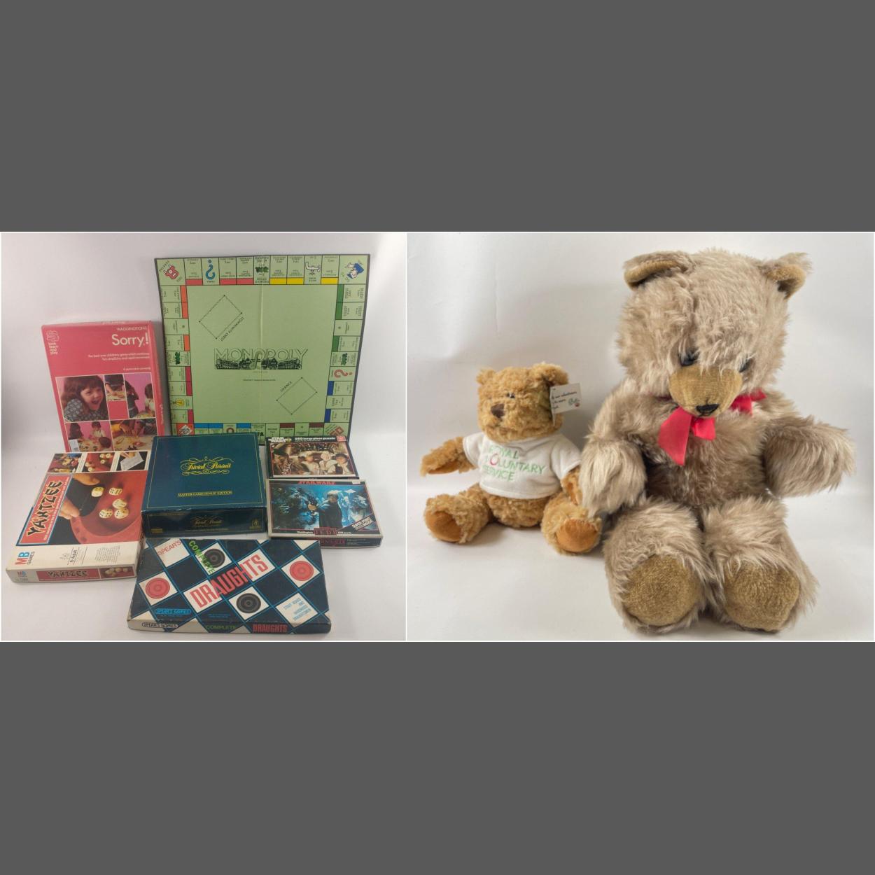 Two cuddly teddy bears the first wearing a Royal Voluntary Service t-shirt sits 20cm high, the second measures approx 50cm plus a selection of Family games including Trivial Pursuit, Sorry!, Yahtzee, Draughts, a Monoploy board and 2 Star Wars jigsaw puzzles each 150 pieces