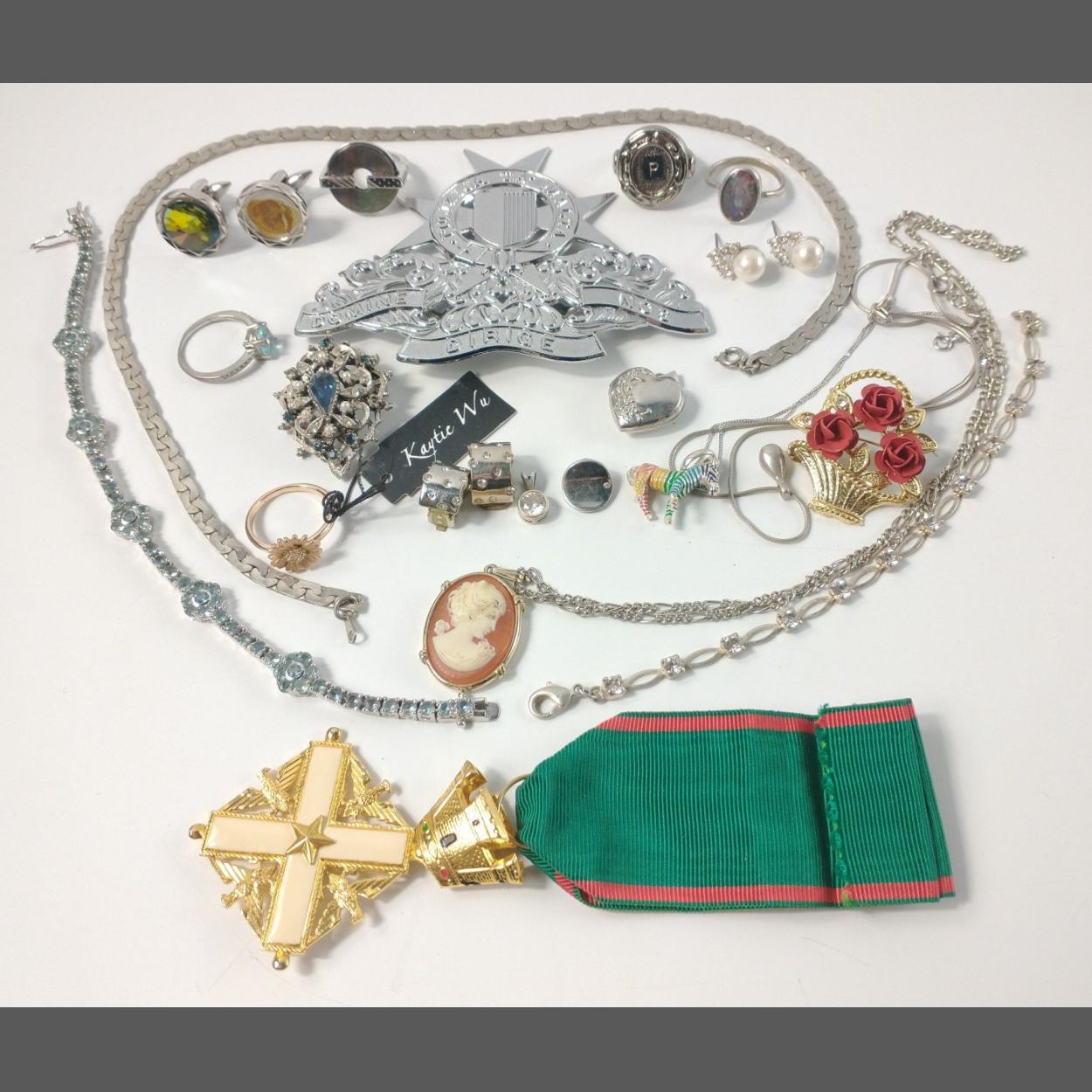 A collection of costume mixed jewellery to include a medal and cap badge Domine Dirige Nos 'The City Of London The Lord1805 Guide Us'