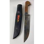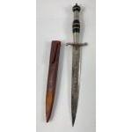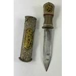 A collection of three knives, one handmade with interesting brass inlay length 32cm approx with sheath, a Far Eastern intricately carved dagger in it's scabbard length 19cm length including its scabbard , also a slimline dagger with hunting scene engraved on one side - length from handle tip to end of blade 27cm, comes with leather sheath...