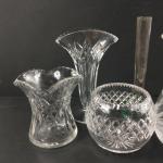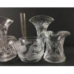 Two pairs of crystal posy vases EDINBURGH CRYSTAL pair stand 8cm high, the other 12cm (one has 2 small chips from rim), plus 2 small bowls each 6cm tall, one with etched thistle design and a green based bud vase