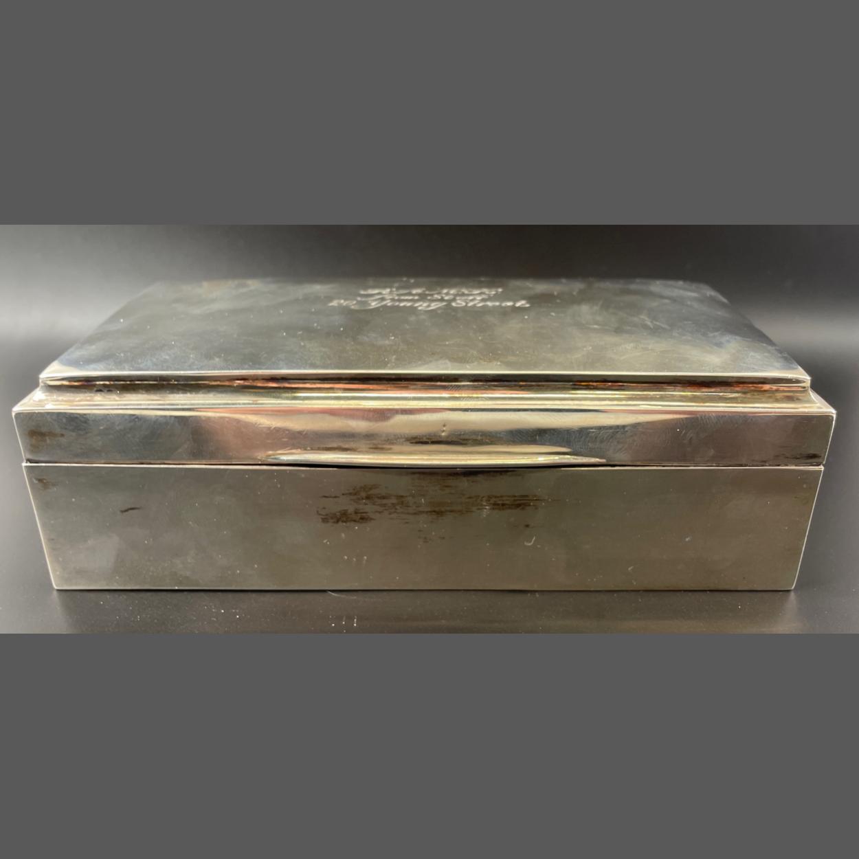 A hallmarked silver cigarette box Birmingham 1937, by WALKER & HALL,17x 8.5x5cm gross weight 585g: inscription reads RA McK from Staff 20 Young Street