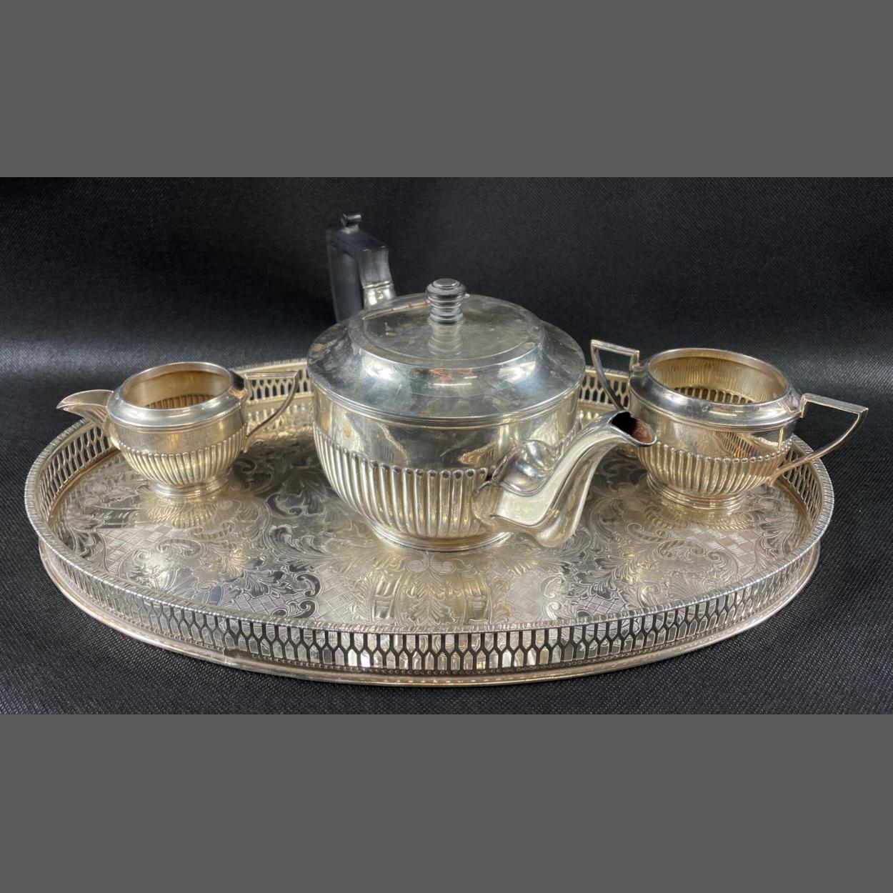 A small WALKER AND HALL vintage teapot, sugar and cream set, teapot stamped 11410 with a VINERS stamped Chased white metal pierced galleried oval serving drinks tray dimensions 38cm x 24cm approx