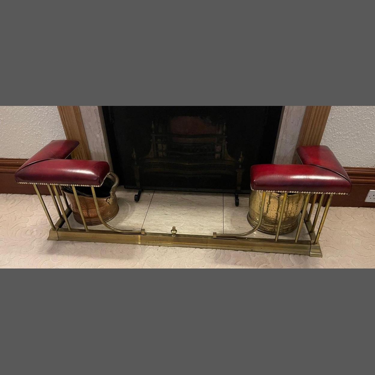 A SUBSTANTIAL EDWARDIAN inspired extendable brass and red leather padded and studded fire fender - dimensions when extended 145cm length x 45cm height x 40cm depth