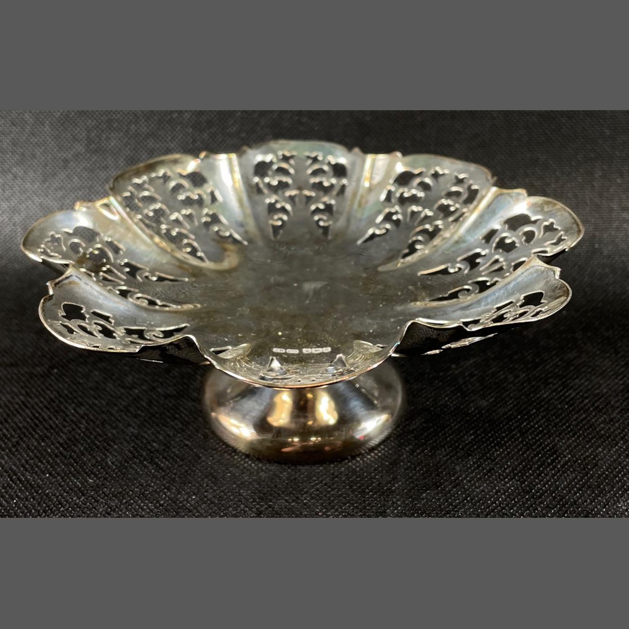 A silver hallmarked pierced bonbon dish, Sheffield 1935, by SYDNEY HALL & CO, 6cm high, 17.5cm wide, gross weight 165g