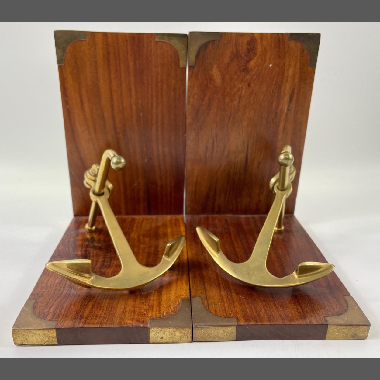 A pair of mahogany and brass trimmed bookends featuring brass ship's anchors - dimensions 15cm x 15cm approx