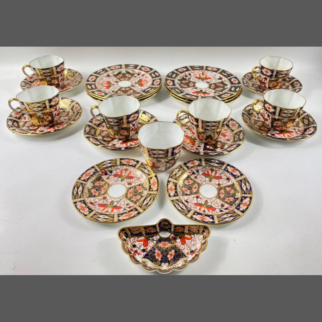 A ROYAL CROWN DERBY tea service in the traditional Amari pattern to include 7 cups (1 cracked), 8 saucers and 6 side plates plus a small scalloped edged dish 11.5cm long