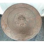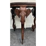 An INDIAN inspired hand carved side table with elephant head and tusks form legs - there is no ivory in this table only white wooden painted tusks and beads for eyes - the elephant form trunks also act as legs - dimensions 53cm diameter x 54cm height approx