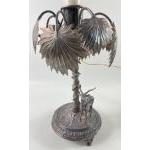 A VINTAGE WMF EP stamped white metal feature table lamp with shade depicting a SCOTTISH STAG with 11 point antlers, a tree serpent with 8 large leaves atop, the lamp in candle form, the base raised on three ornate feet - full height 60cm approx