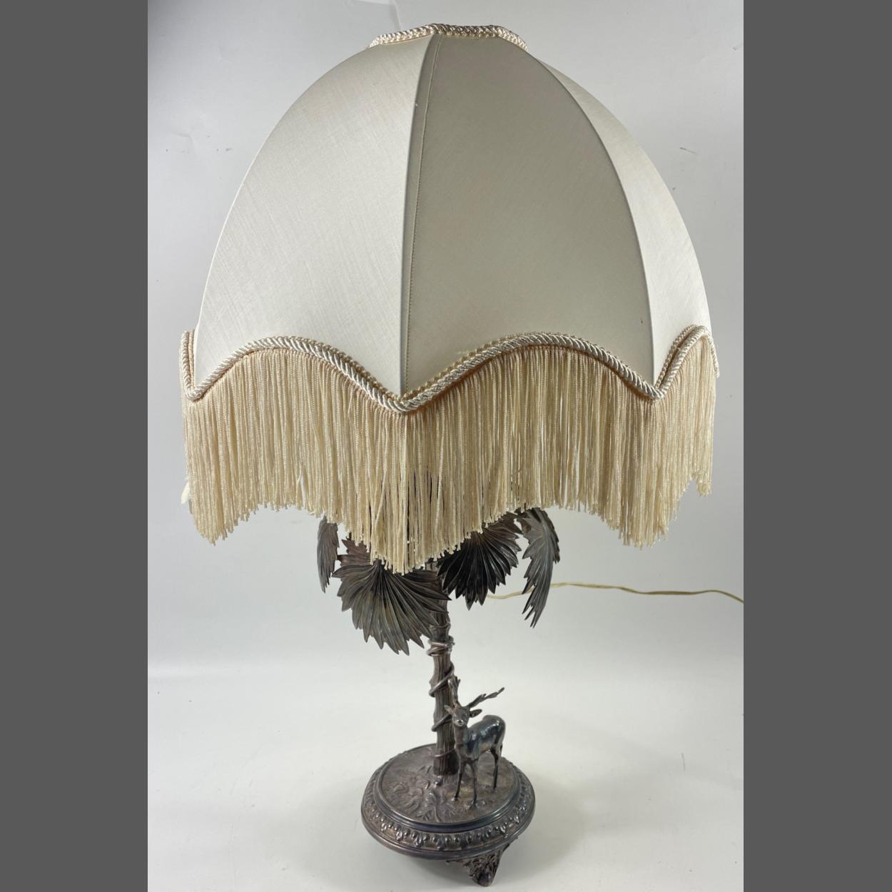 A VINTAGE WMF EP stamped white metal feature table lamp with shade depicting a SCOTTISH STAG with 11 point antlers, a tree serpent with 8 large leaves atop, the lamp in candle form, the base raised on three ornate feet - full height 60cm approx