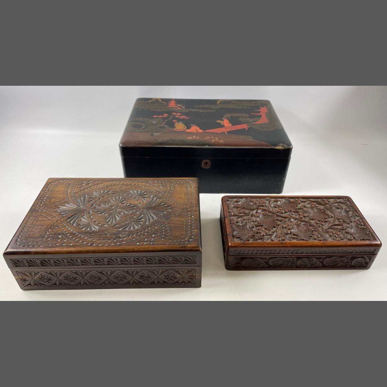 Three wooden boxes including one with carved design of leaves and berries (21.5x11x5cm), an Oriental japanned box (30x22x11cm), and another carved box (24x15x8cm)
