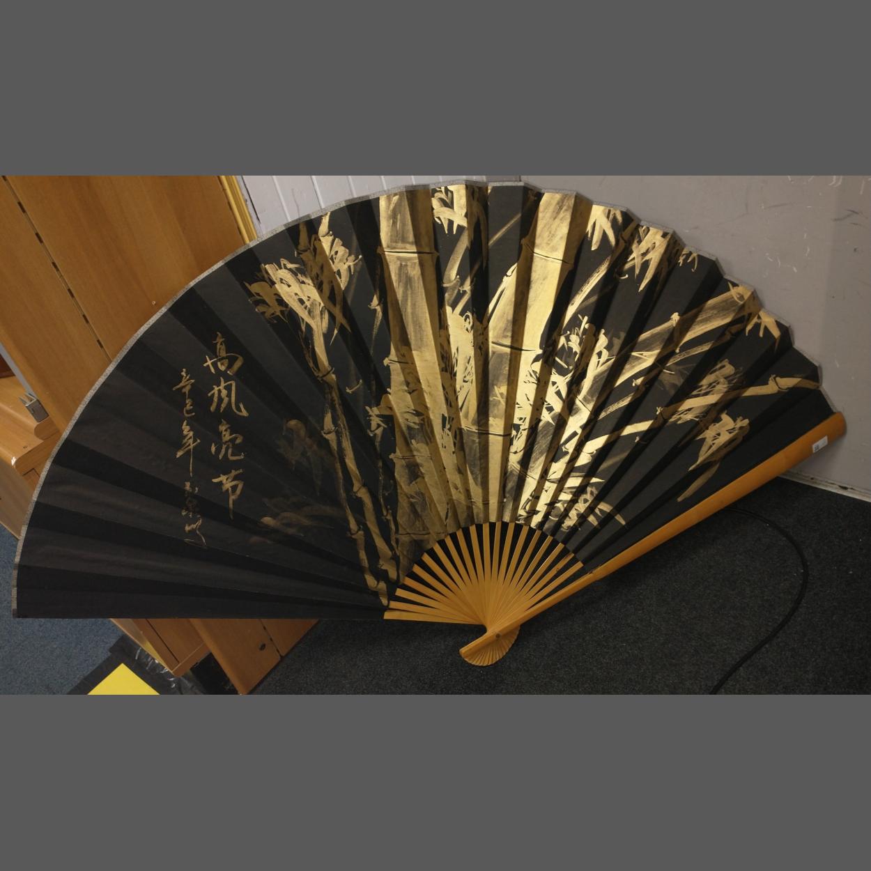 A large Oriental fan with a pattern of bamboo in black and gold, length 90cm