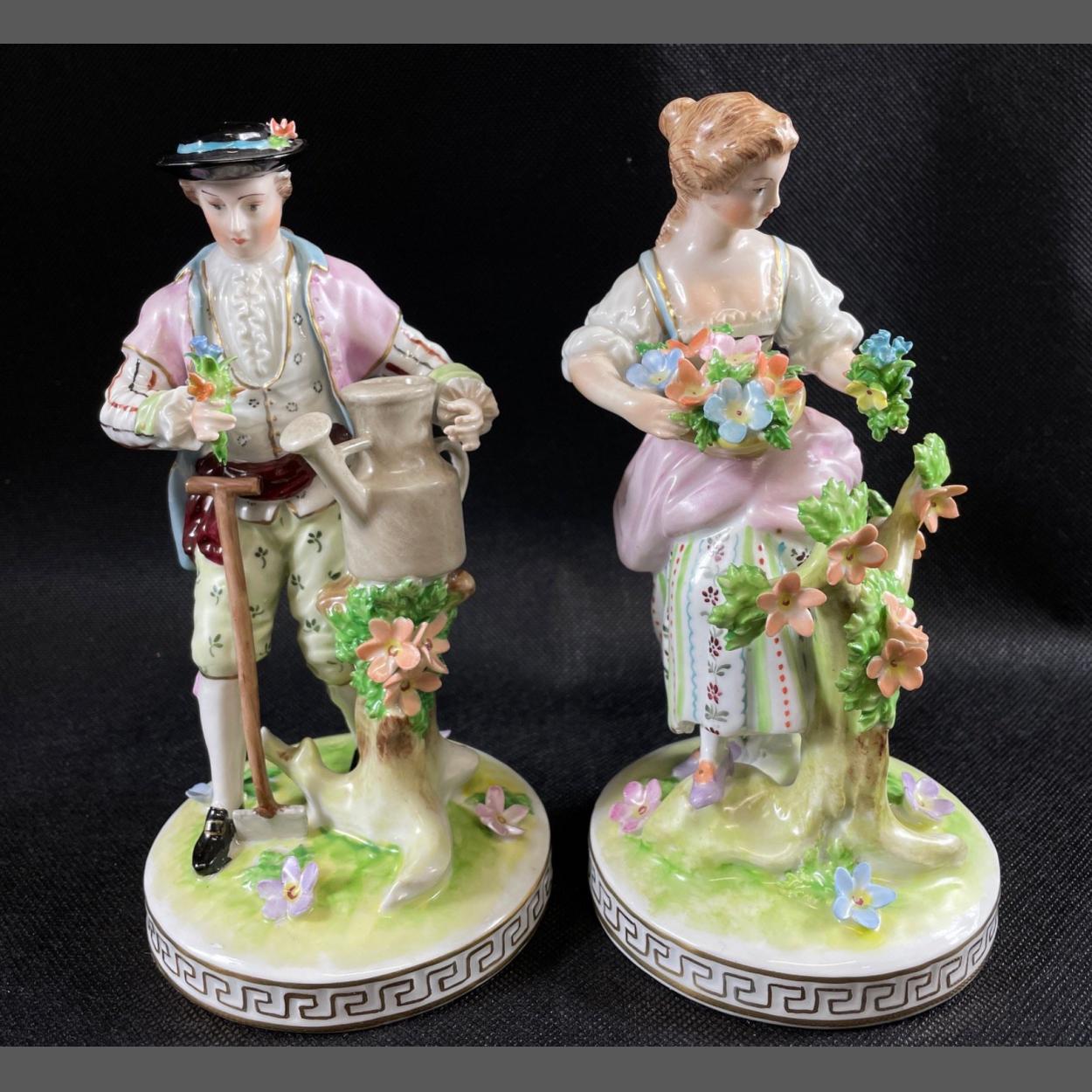 Two figurines labelled 'Original Dresden' and impressed 10890, of a man with a watering can, and a lady carrying a basket of flowers plus another bunch (a tiny chip missing from flower on man's hat) each stands approx 19cm tall