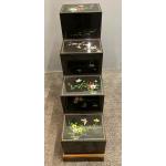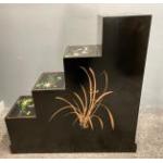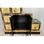 AN UNUSUAL STEPPED ORIENTAL decorative gold and black lacquered storage cabinet - black based with highly decorative floral patterns - 6 drawers and two door cupboard