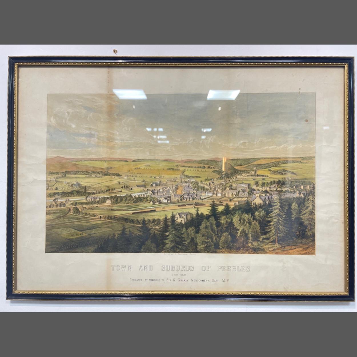 RARE PEEBLES LOCAL INTEREST - Town and Suburbs Of Peebles - An c19th century antique colour lithograph of PEEBLES by R Paterson of Edinburgh - showing the Borders train line to Berwick, 'Simply Fascinating Picture' - dimensions 70cm x 50cm