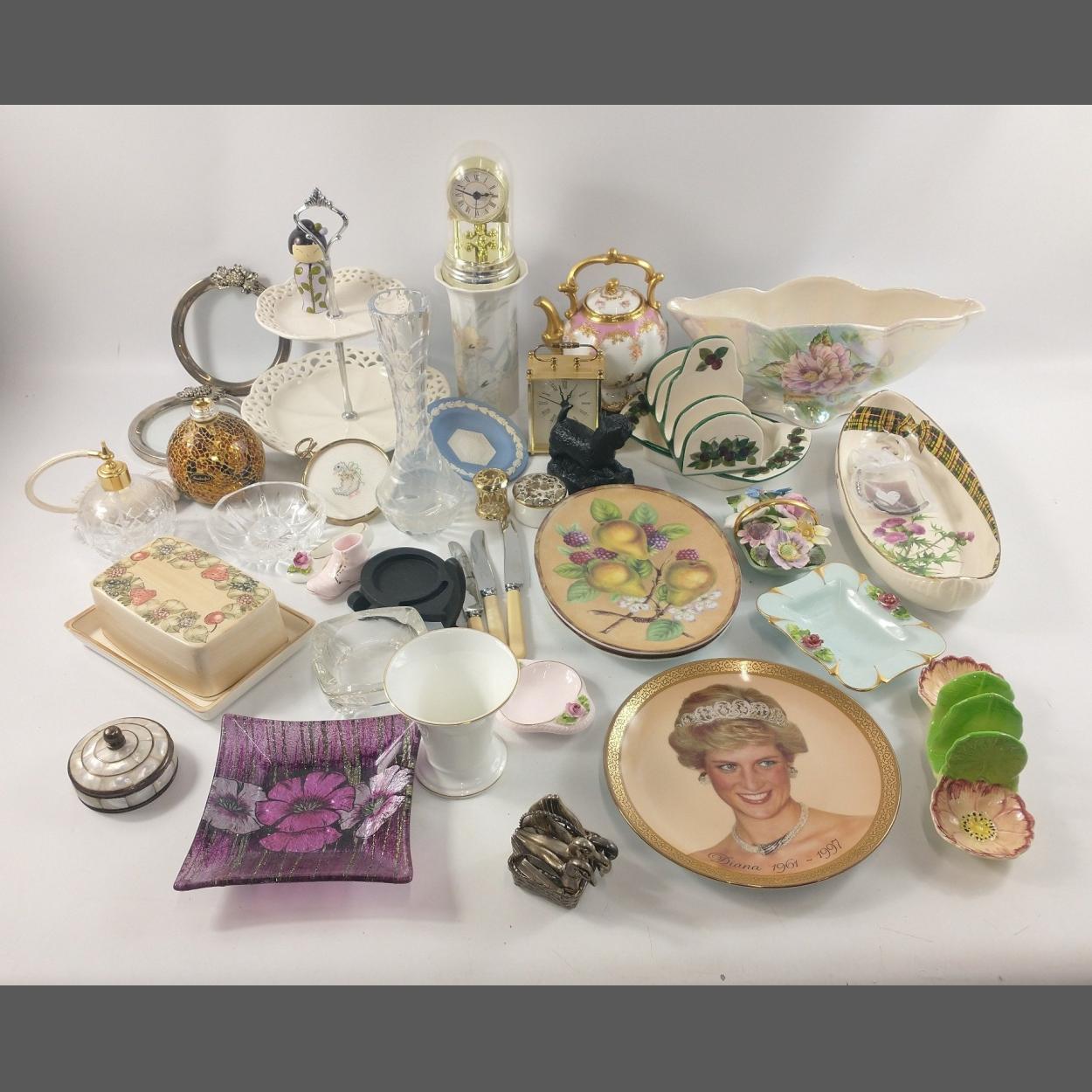 A mixed box with lots of china to include a JERSEY POTTERY covered butter dish, a WEDGWOOD Girl Guides diamond jubilee dish (11cm), a floral design vase by ROSENTHAL Studio Linie (15cm tall), a WEDGWOOD 'Chinese Legend' dish (16.5cm dia) and much, much more