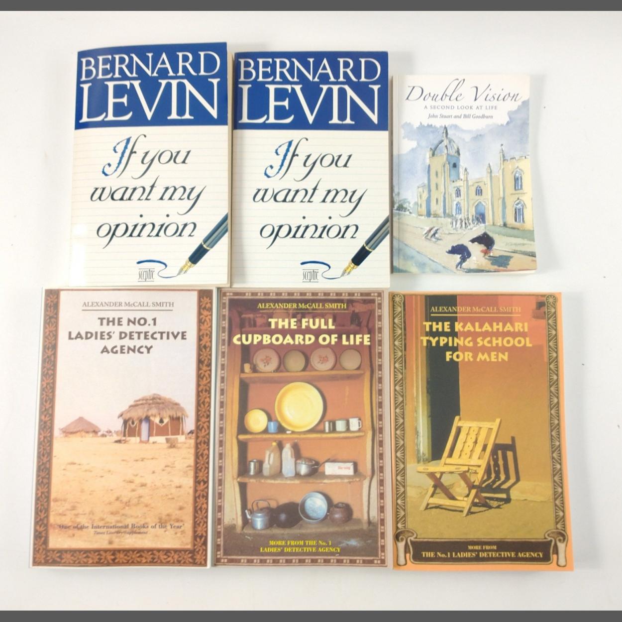 Three signed books by the ever-popular ALEXANDER McCALL SMITH being The No.1 Ladies Detective Agency, The Kalahari Typing School for Men, and The Full Cupboard of Life plus a signed 1st edition copy of PEEBLES INTEREST Double Vision by John Stuart and Bill Goodburn and 2 copies of 'If You Want My Opinion' by Bernard Levin, one copy is missing the last page of the book, there is a replacement copy and letter of apology from Hodder Stoughton with this lot
