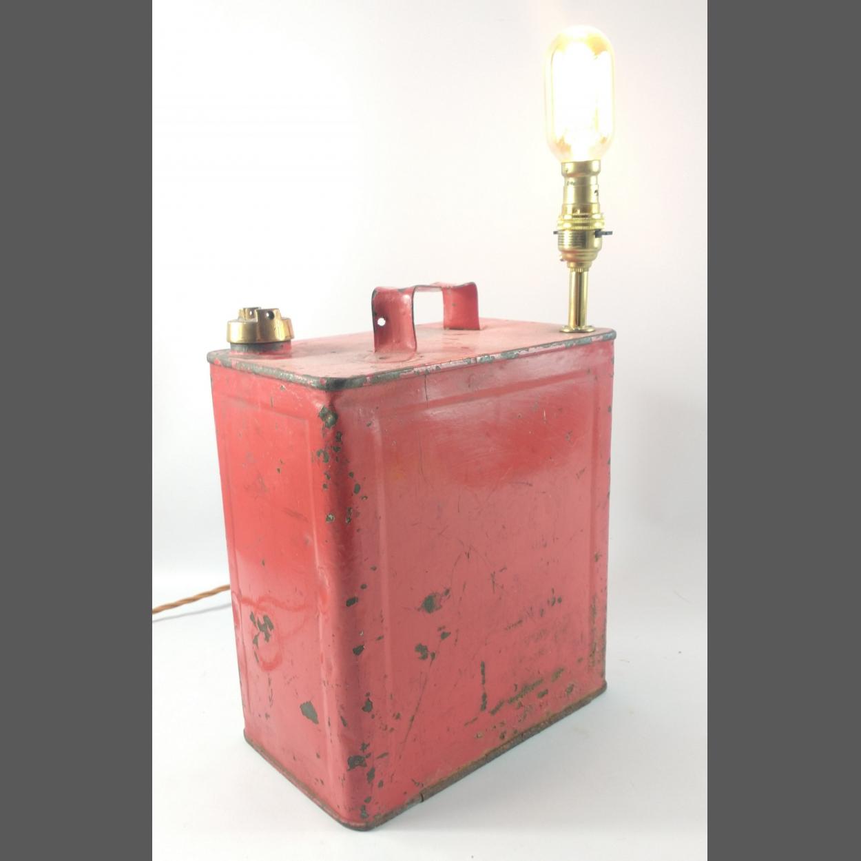 STEAMPUNK! a vintage c1930's REDLINE petrol can with original brass screw-top lid converted quite cleverly to an electric table lamp! - would make a fabulous decorative focal point in any room! - dimensions 48cm height(from ground to the tip of the bulb x 14cm width x 24cm length approx