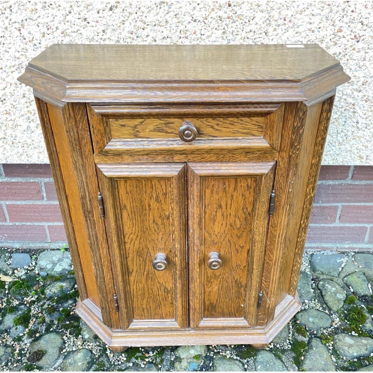 A sturdy medium sized two door oak veneer cabinet with three shelves and a top drawer - 2.5ft long x 10†depth x 3ft height