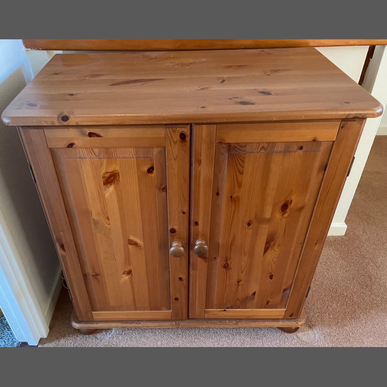 A two door pine cabinet with two doors and a storage shelf on bun feet - with a pull out shelf - dimensions length 80cm x 46cm depth x height 82cm approx