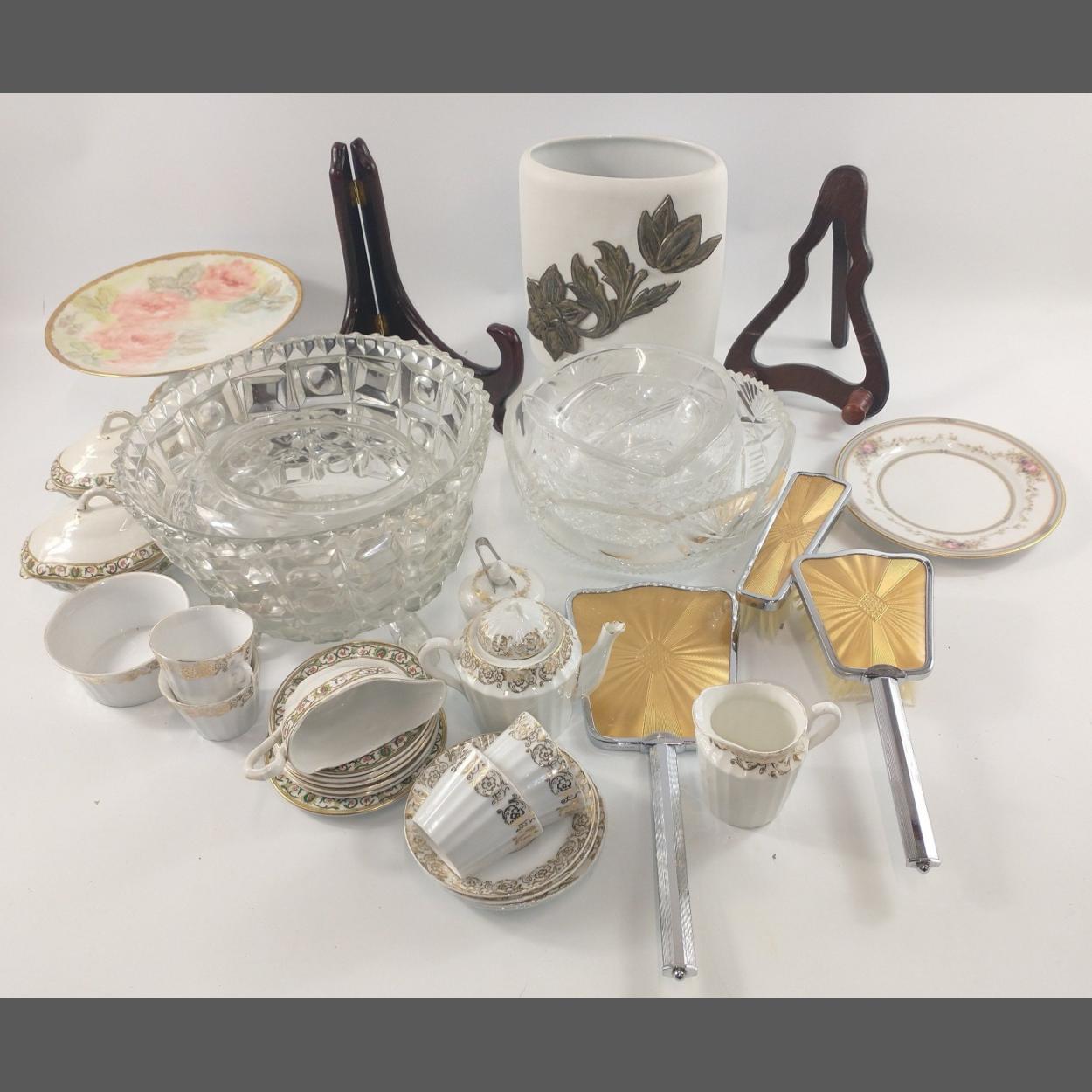 A mixed box to include 5 cut glass bowls, a hand-painted Tazza by M Needham (9cm tall), miniature tea set in white and with a gilt design comprising 4 cups (6cm dia), 4 saucers (10.5cm dia, 1 damaged), a teapot (10cm tall), a milk jug and sugar bowl (9cm dia, slight crack) plus a KAISER STRASBOURG lidded bowl with tongs (6cm dia), plus 1 other mini service by RIDGWAYS BURLEIGH including 6 plates (10cm), 2 lidded dishes (11.5cm tiny chip from one)and a mini sauceboat etc