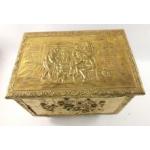A brass repousse taverna style fireside coal or log box on castors - dimensions 43cm x 30cm x 28cm depth approx