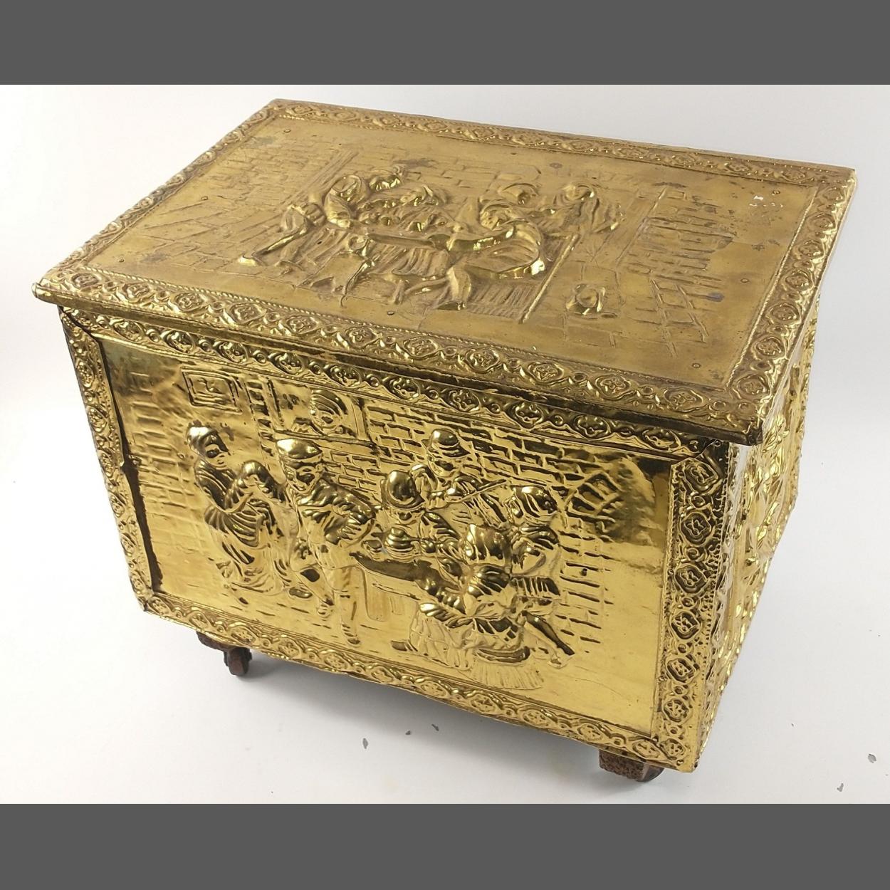 A brass repousse taverna style fireside coal or log box on castors - dimensions 43cm x 30cm x 28cm depth approx