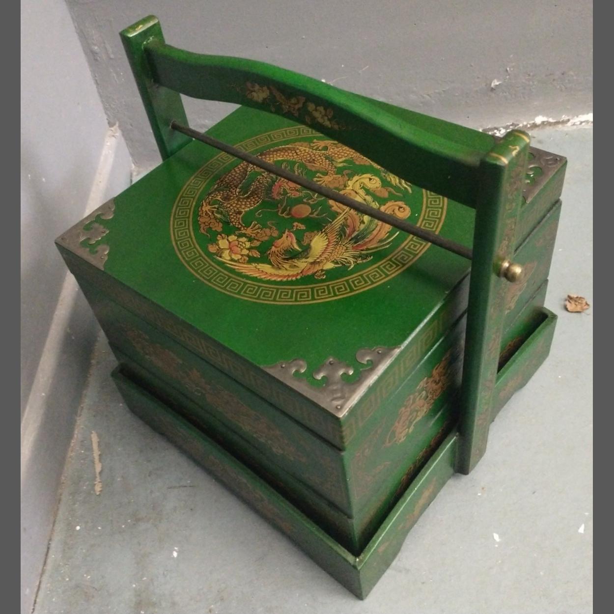 An ORIENTAL HIGHLY decorative green and gold painted lacquered with carry handle mock food carrier - unused item in storage