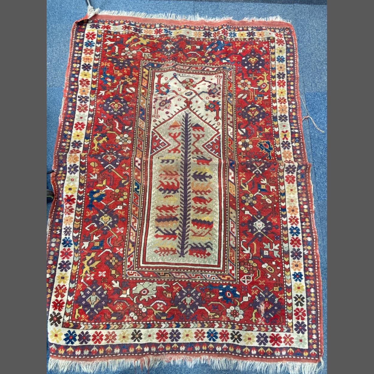 A handmade INDIAN rug in warming shades of red and cream 150x105cm, slightly frayed at edges