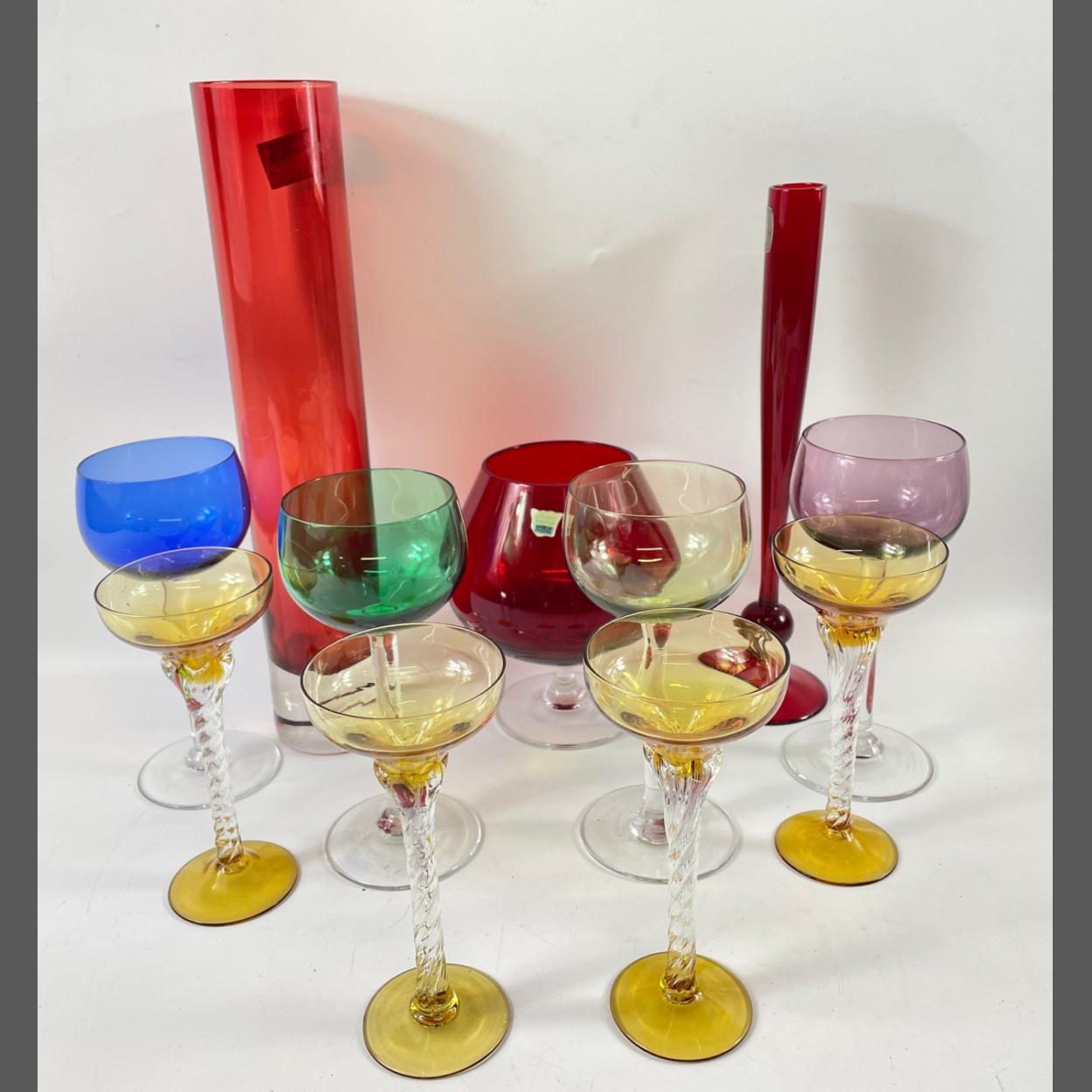 A colourful collection of glass including a WHITEFRIARS red posy vase (27cm), a Swedish SMALANDS KUNSTLAS overlarge red brandy glass (15cm tall), 4 hock glasses, 4 amber liqueur/shot glasses with twisted stems (1with hairline crack) and a tall red vase (32cm tall)
