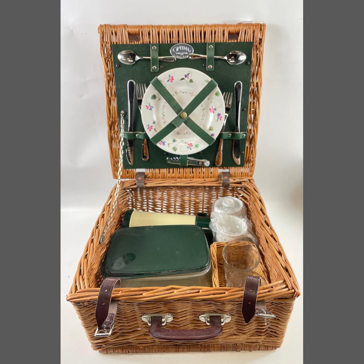 A smart wicker basket containing a JOHN LEWIS PICNIC SET for two complete with flask