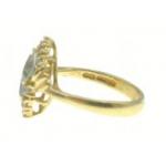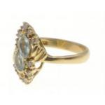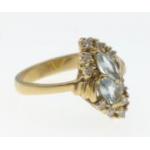 DIAMONDS ARE A GIRLS BEST FRIEND! 750 (18ct) stamped yellow gold with 10 small diamonds(tested) with two central blue topaz style oval stones weight gross 3.75g approx ring size M