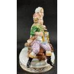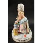 A DRESDEN (M7107) winter grouping of a boy on a sledge with axe and a girl with hot chestnuts with a 20th century Dresden trademark stamp, stands 12cm tall, no chips