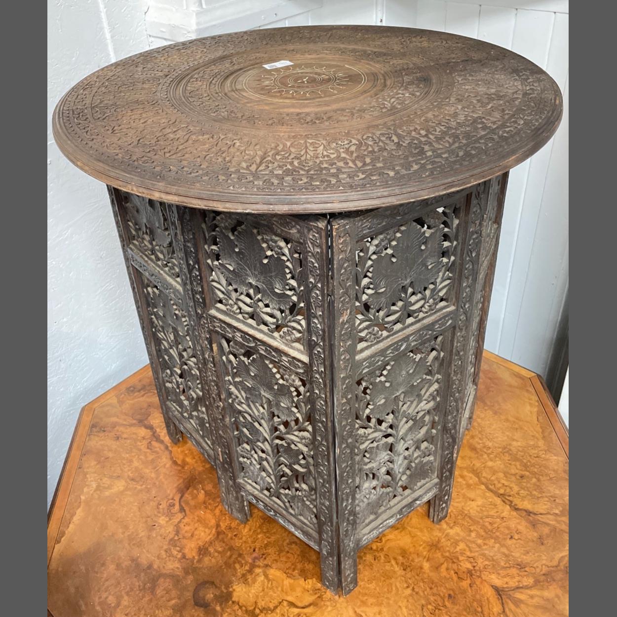 A beautiful INDIAN hand carved circular folding octagonal hinged base table - diameter 60cm height x 61cm diameter