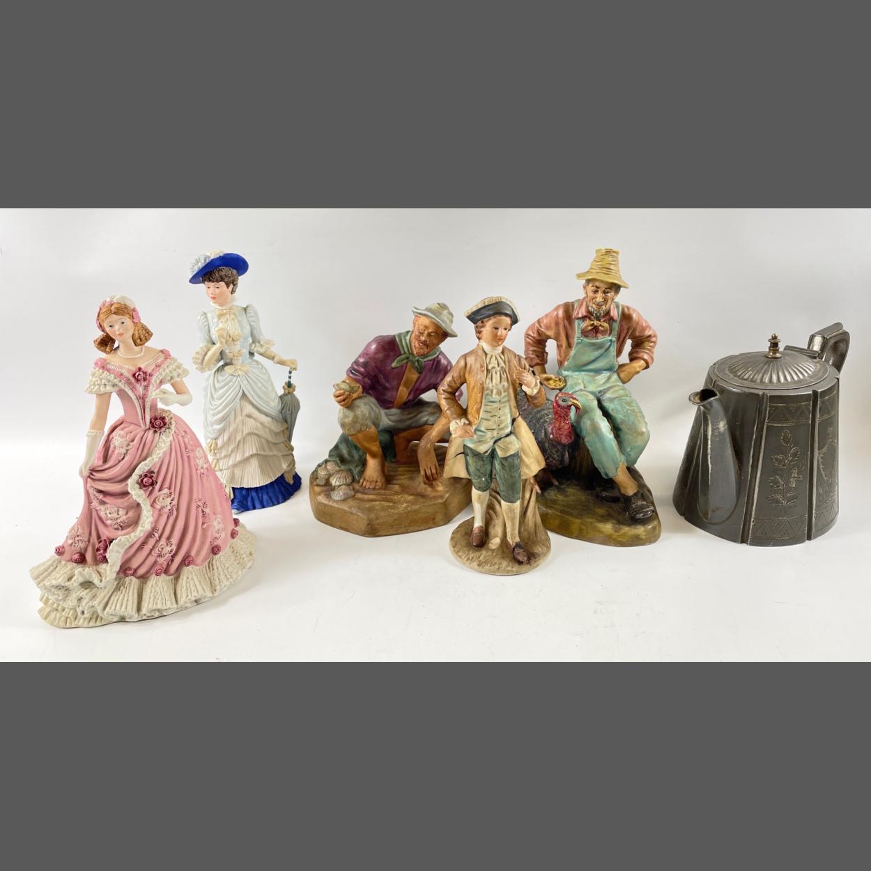 Two collectable over-sized ROYAL DOULTON figures to include 'Thanks Giving HN No 2446 and 'The Beachcomber' HN No 2487(shell slight damage repair on this one), largest figurine height 21cm approx with also two WEDGWOOD figurines 'The Coronation Ball' No 426 and 'Golden Jubilee' No 046 and two other unnamed figures with a VINTAGE EPBM teapot!