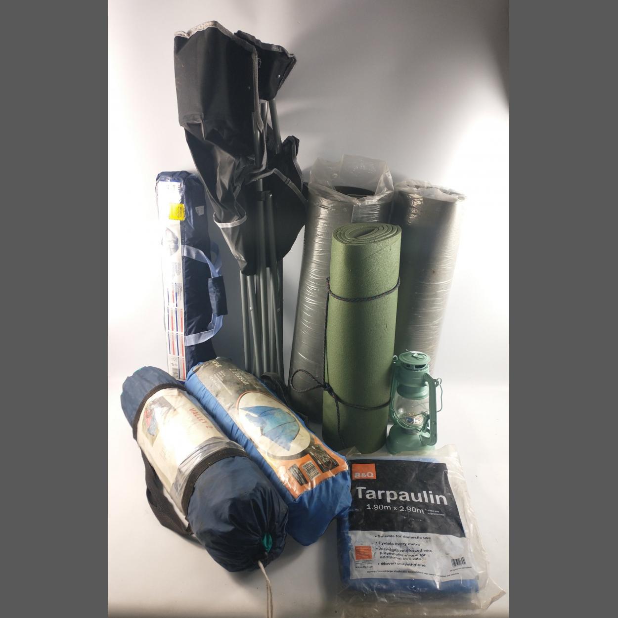 Prepare for warmer times to come with this selection of CAMPING GEAR to include a TESCO 2-person dome tent, a PURSUIT cross tent 2 person, and a Valley 2 WYNNSTER tent along with 3 camping mats and a foldaway chair plus an unopened tarpaulin 1.9x2.9m and a small battery operated storm lantern