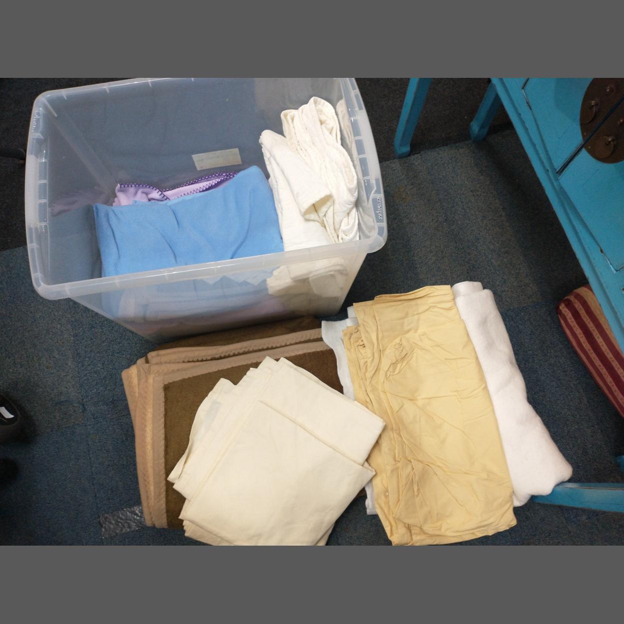 A large plastic storage box rammed full of bedding to include 6 blankets plus sheets and a mattress cover