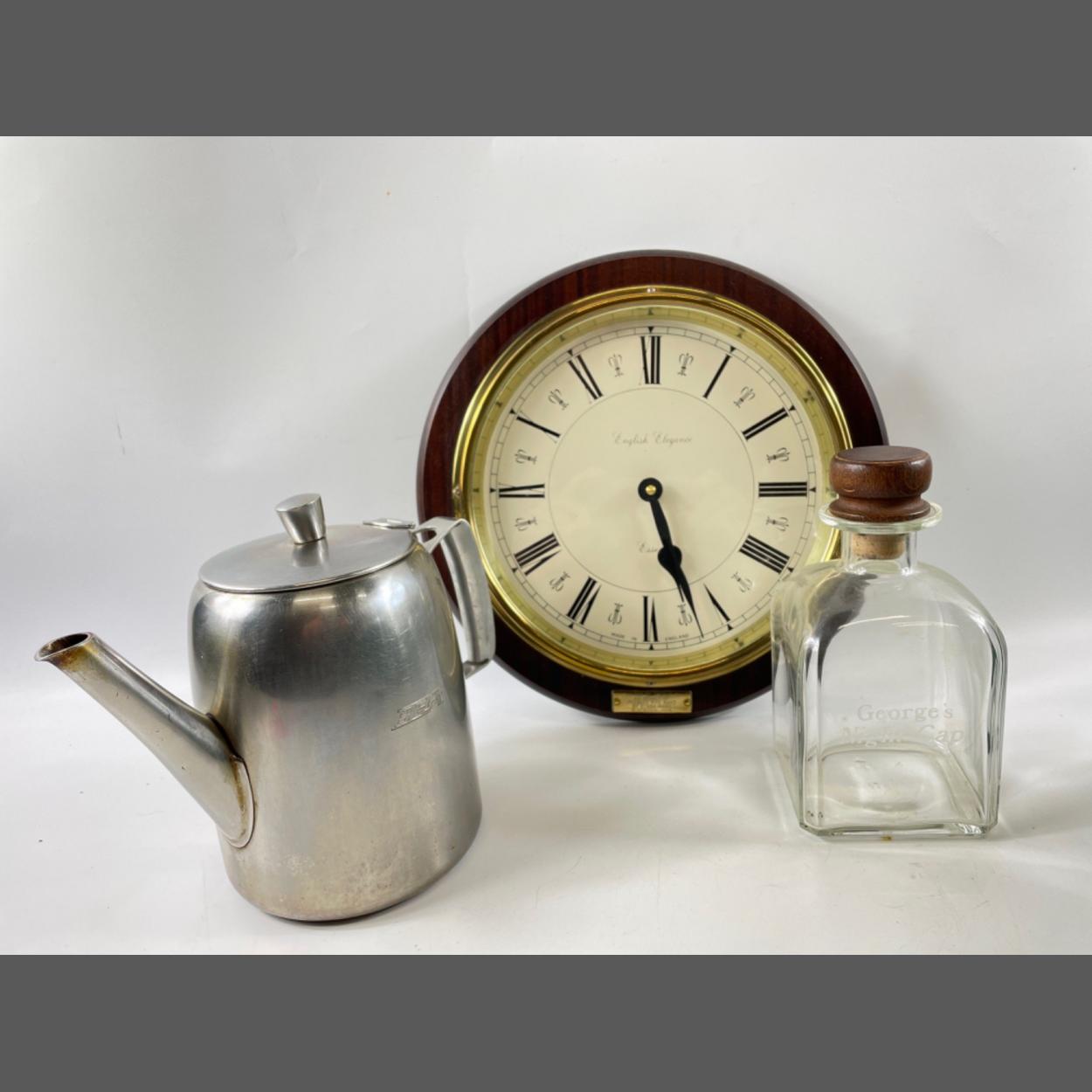 A mixed box to include a wall clock by ENGLISH ELEGANCE (30cm dia) presented to the Peebles Pipe Band in 1986, a decanter inscribed 'George's night cap', and a 3pint teapot from BEA