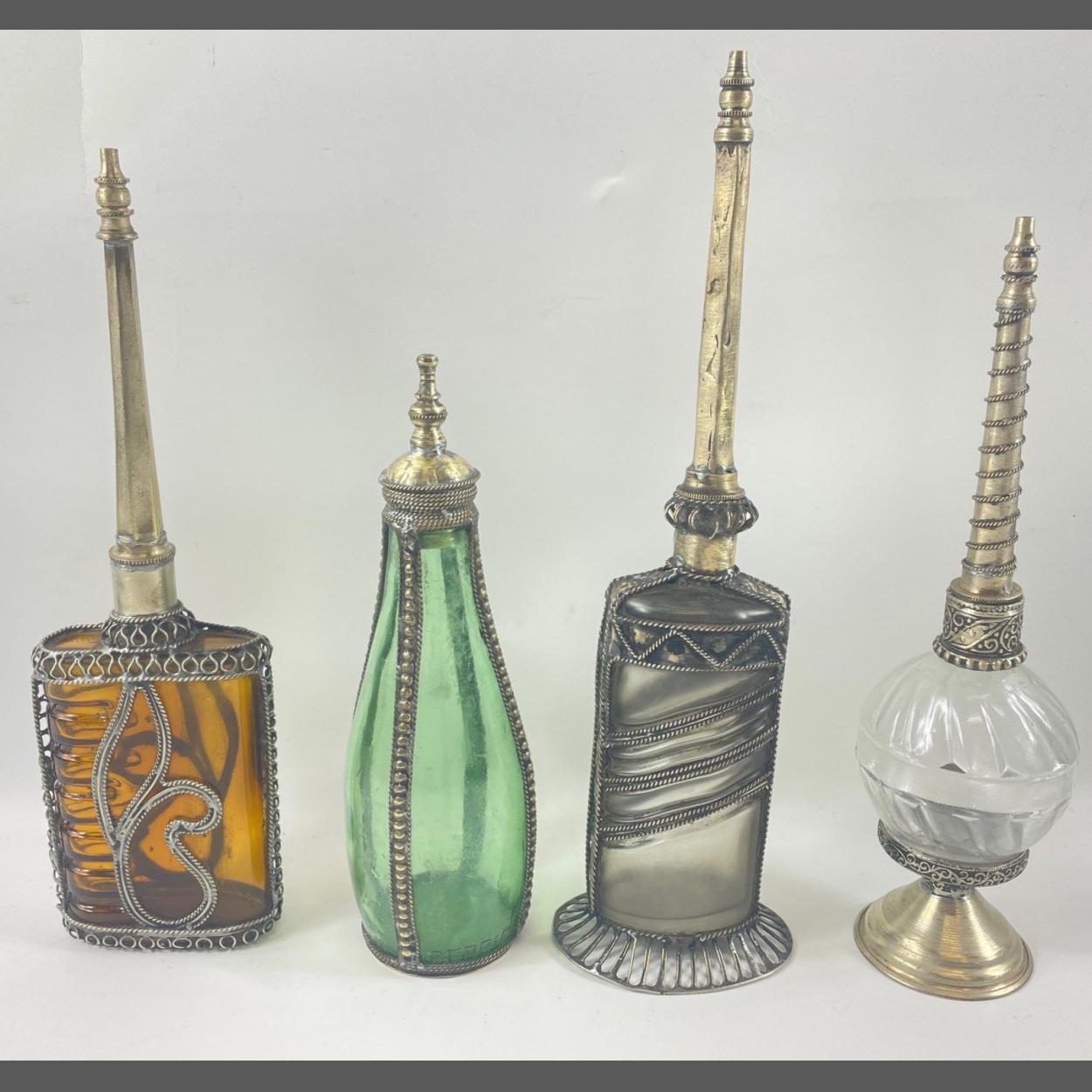 Four unusual upcycled DECORATIVE glass bottles each decorated with white metal trims, the tallest stands 28cm, the smallest (made from a Perrier water bottle) 20cm, the three bigger bottles each have a removable screw spike whilst the smallest has a pull-out stopper