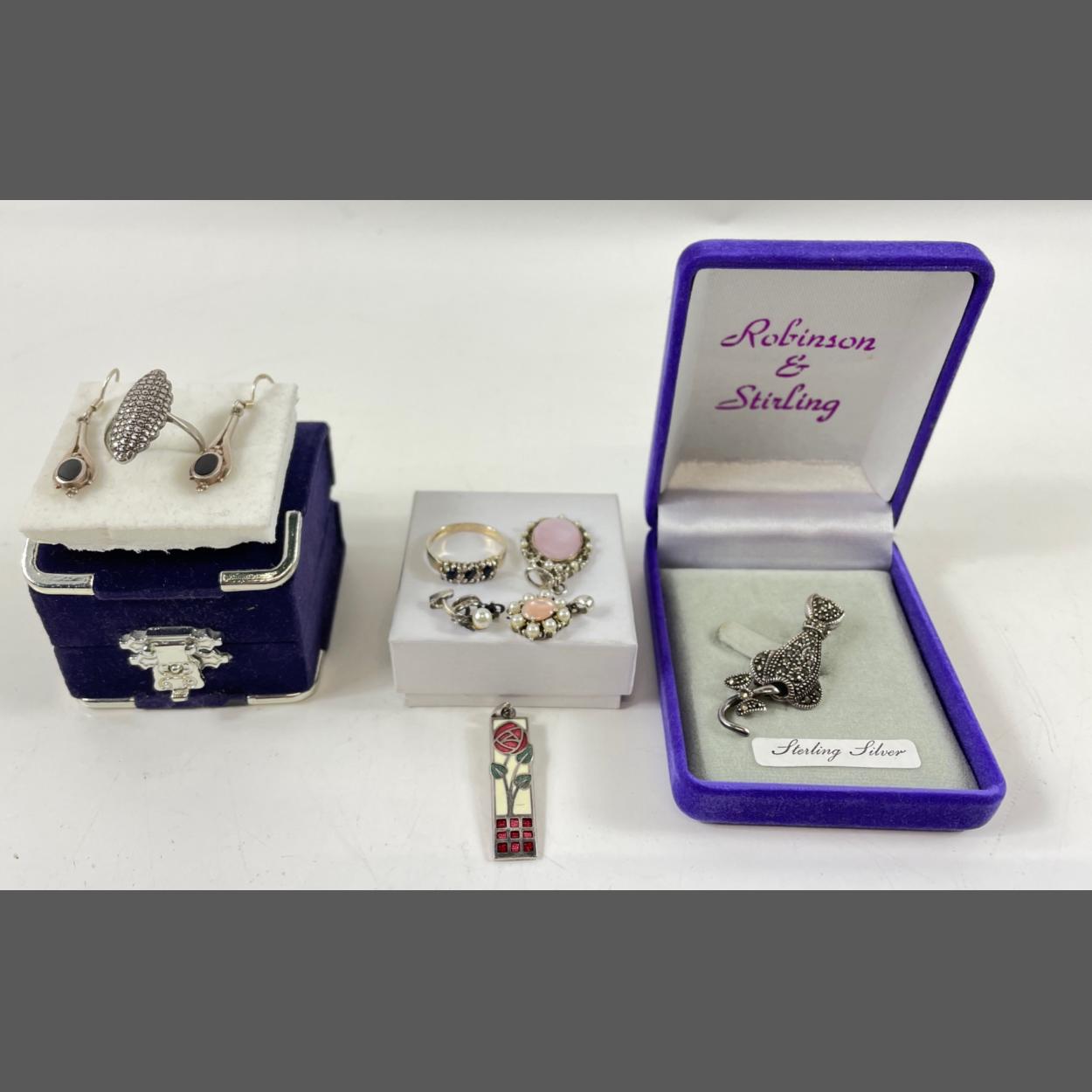 A MARCASITE BROOCH stamped 925 (4cm long) of a cat with a swishing tail, a marcasite ring stamped 925 silver 2.5cm long Size M and a pair of black enamel earrings (3cm long), plus a box of 925 items including a ring with blue stones Size K and 4 pendants including a RENNIE MACINTOSH rose (3cm long),