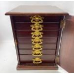 A medium table-top Edwardian mahogany drawer set cabinet with lockable door with key, and six similar sized drawers with a larger seventh bottom drawer, all with nice brass handles. - dimensions of the outer cabinet 13" Depth x 11.5" Width x 15" Height