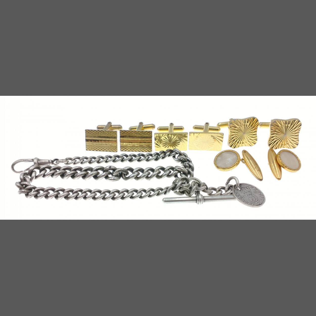 A Sterling silver watch chain with a 1912 3-penny coin attached, 33cm long gross weight 46g plus 4 pairs of cufflinks
