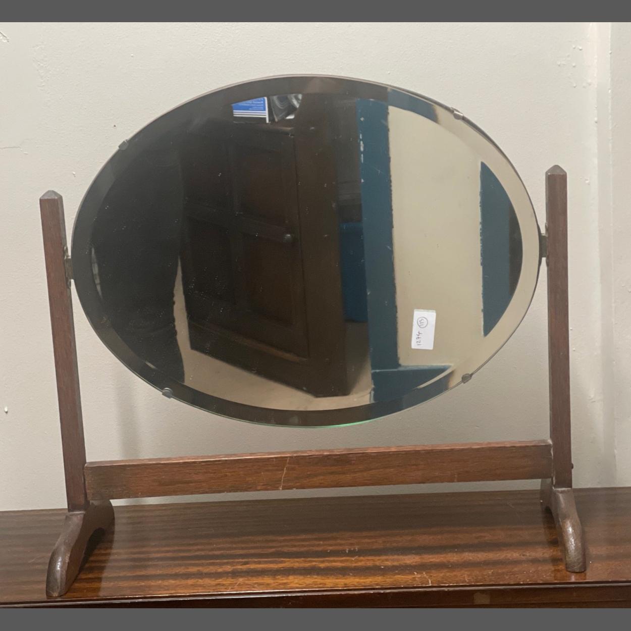 A small dressing table top swing oval mirror within an oak stand - dimensions length 55cm x height 48cm