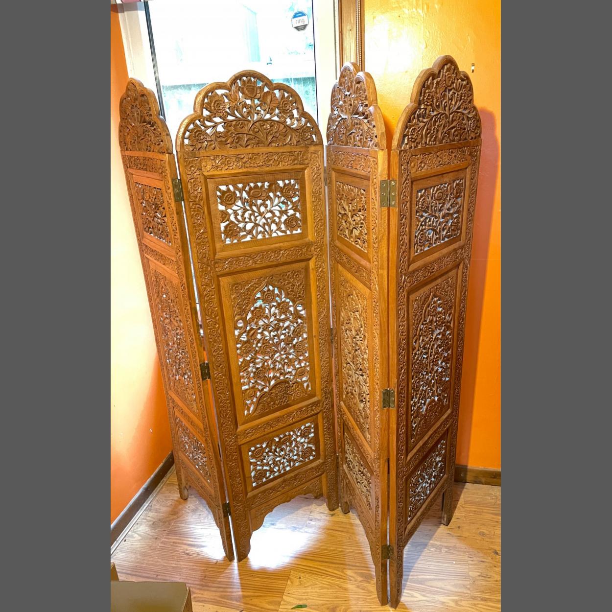 A SUBSTANTIAL hand carved with flora pattern four folding room divider - 6ft height with each panel 18”width approx