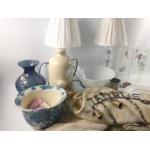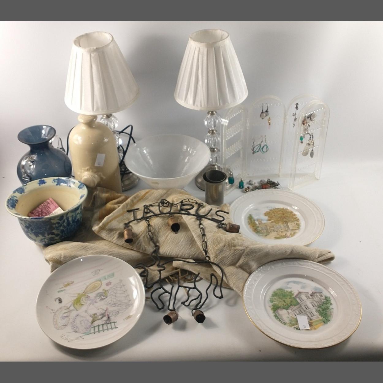 A mixed box to include a stone pig, a pair of table lamps, a Leonardo white glass bowl, a clear perspex earring holder etc, etc
