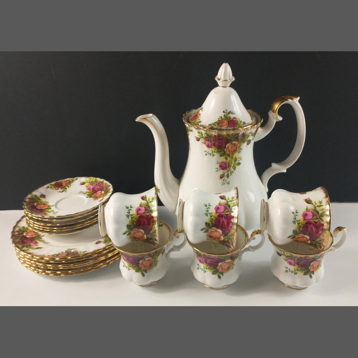 A ROYAL ALBERT Old Country Roses coffee service to include 1 coffee pot, 6 demi tasse cups, 6 saucers and 6 side plates