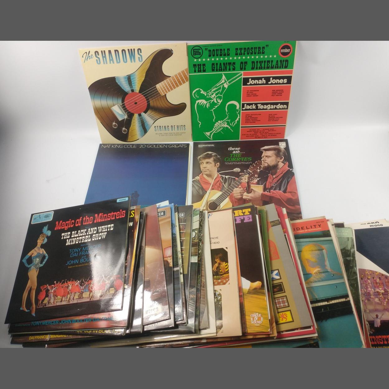 A large collection of VINYL LP's to include THE SHADOWS String Of Hits HIGH SOCIETY, THE BLUES HERITAGE ( King Oliver Louis Armstrong Besse Smith) CHRIS BARBER JAZZ BAND & Also Jazz BARBER & BILK DOUBLE EXPOSURE The Giants Of Dixieland BBC THE LAST GOON SHOW OF ALL FLANNAGAN & ALLEN, I WAS THERE MAX BOYCE Live in Concert 1978, THE CORRIES Live From Scotland Vol 1&2, MOLLY WEIR Down Memory Lane 1976, NAT KING COLE 20 Golden Greats, JAMES LAST in Russia, THE WORLD OF YOUR HUNDRED BEST TUNES (several albums) MAGIC OF THE MINSTRELS(Several albums) and much more!