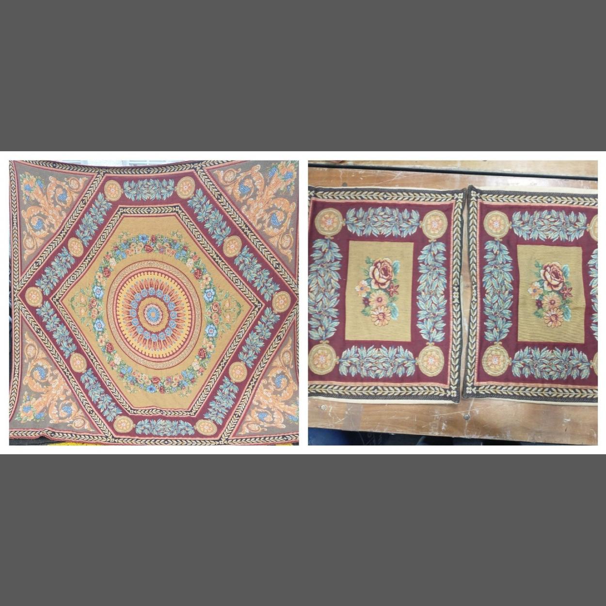 A BESPOKE quality padded reversible throw 240x240cm approx in shades of blue on one side and red and gold on the other with 2 matching pillow cases
